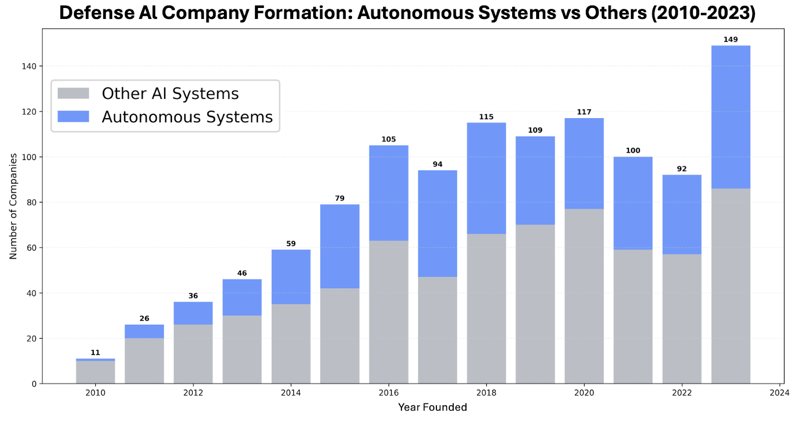 Figure Note: Methodology: Analysis based on a comprehensive dataset of defense and military AI companies in the US and allied nations from PitchBook, supplemented with proprietary research. Companies classified as "Autonomous Systems" based on product descriptions, domain focus, and AI value chain positioning using keyword analysis for autonomous, drone, UAV, unmanned, robotics, and related terms. Autonomous systems are defined as AI technologies capable of making decisions independently and taking action without direct human intervention or with human-in-the-loop, representing the most advanced form of artificial intelligence deployment in defense applications. Data includes founding dates, financing status, domain specialization, and technology focus areas. Sample filtered to companies founded 2010-2023 with valid founding year data (n=1,284).